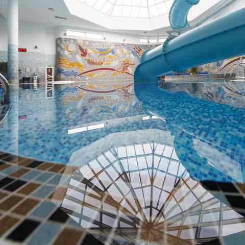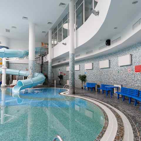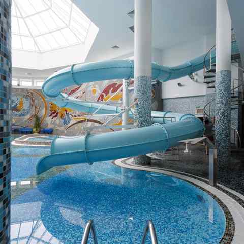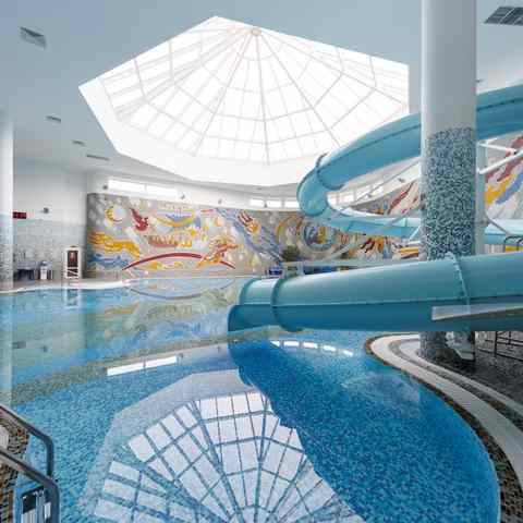 Гостям доступны занятия в тренажёрном зале с современными силовыми и кардиотренажёрами, помощь квалифицированных тренеров и помощь в составлении индивидуального плана питания. В аквазоне работает бассейн длиной 25 метров с температурой воды 29°, джакузи, водная горка, гейзер, подводные пушки и водопады. Детям от 3 лет предлагается отдельный мелководный бассейн. Дополнительно можно посетить финские сауны (80–100°), кедровую бочку с травяными сборами и завершить сеанс чаепитием.